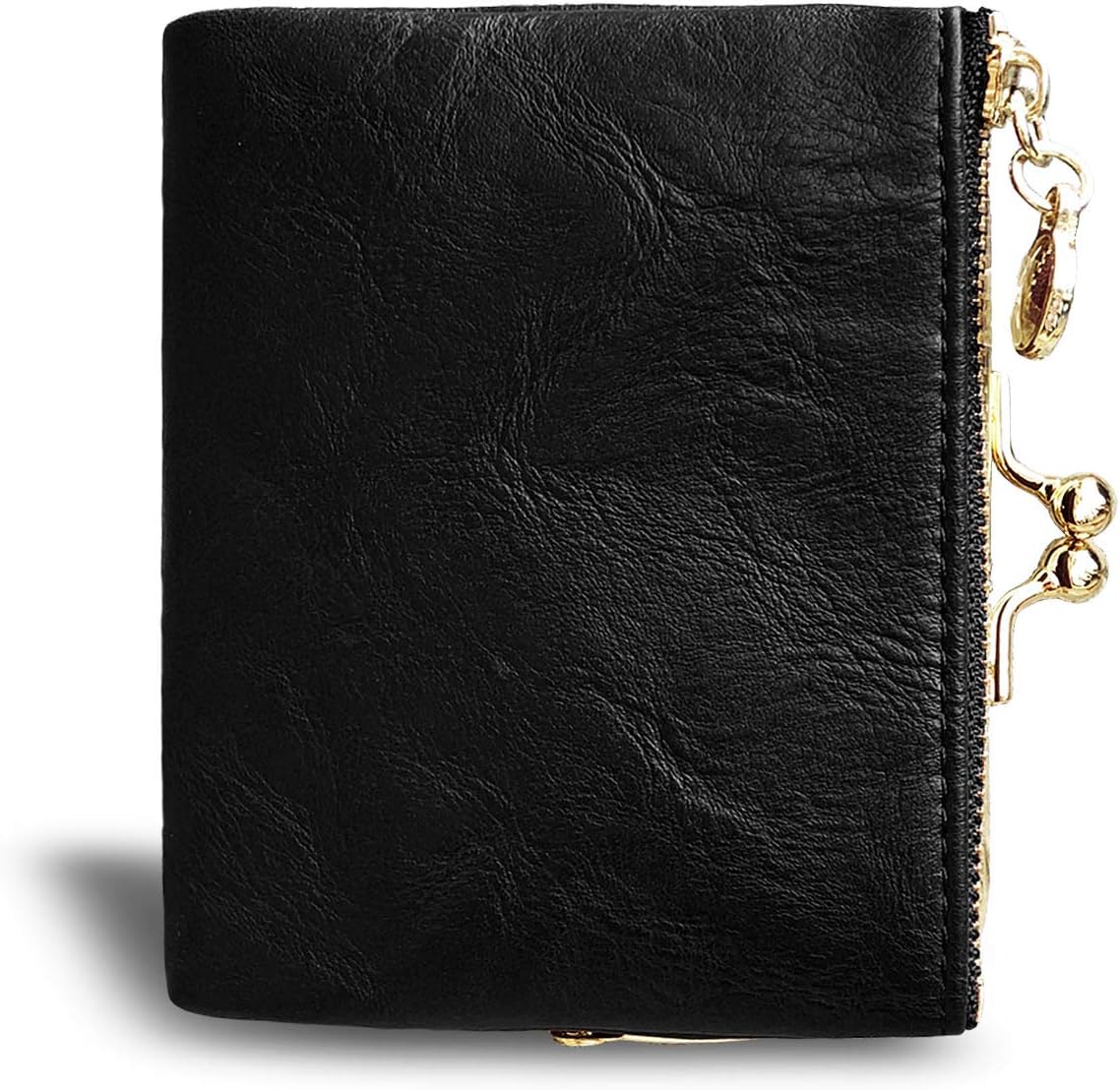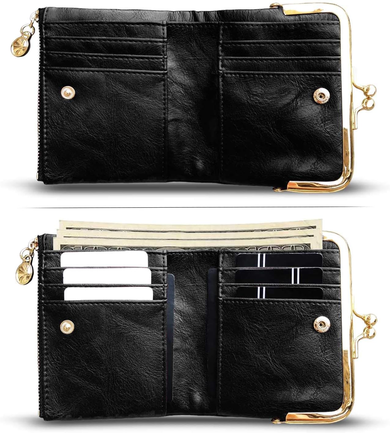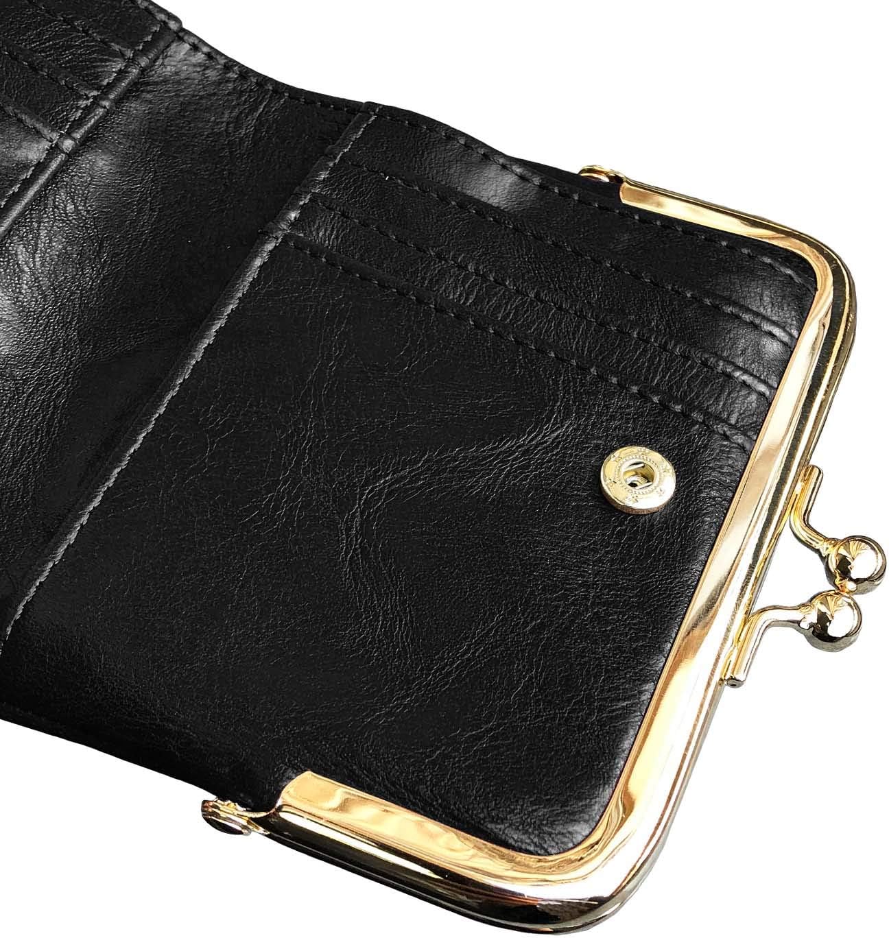 AOXONEL Womens Wallet Small RFID Ladies Compact Bifold Leather Vintage Coin Purse with Zipper and Kiss Lock (Black)