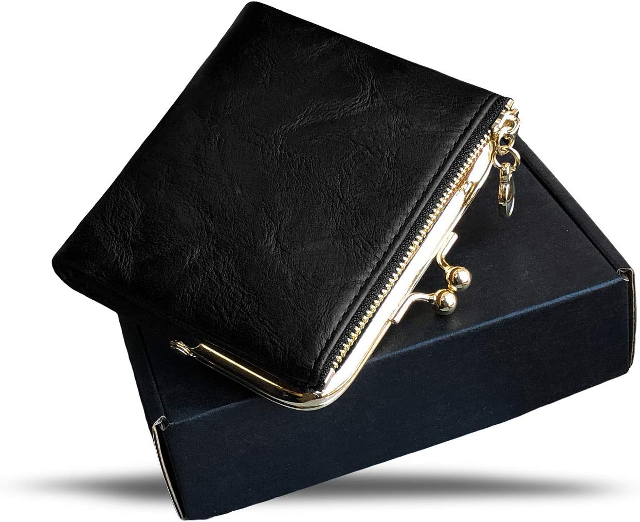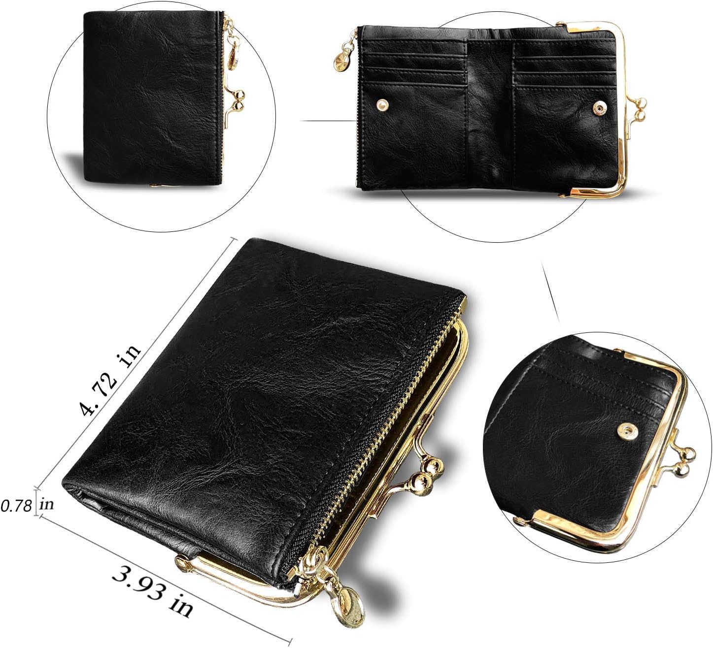 AOXONEL Womens Wallet Small RFID Ladies Compact Bifold Leather Vintage Coin Purse with Zipper and Kiss Lock (Black)