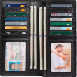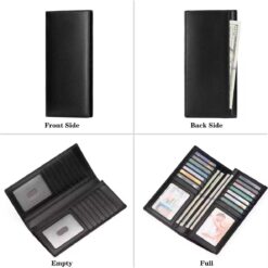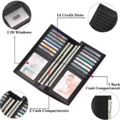 - Cash and Credit Card Holder: Designed for men; Long breast wallets for your suit; Size:19.28 x 9.5 x 1.98 cm/7.59″(L)*3.74″(W)*0.78″(H); 14 cards slots 2 ID windows, 4 long bill compartments; You can get an organizer with many pockets and all your items have their place.